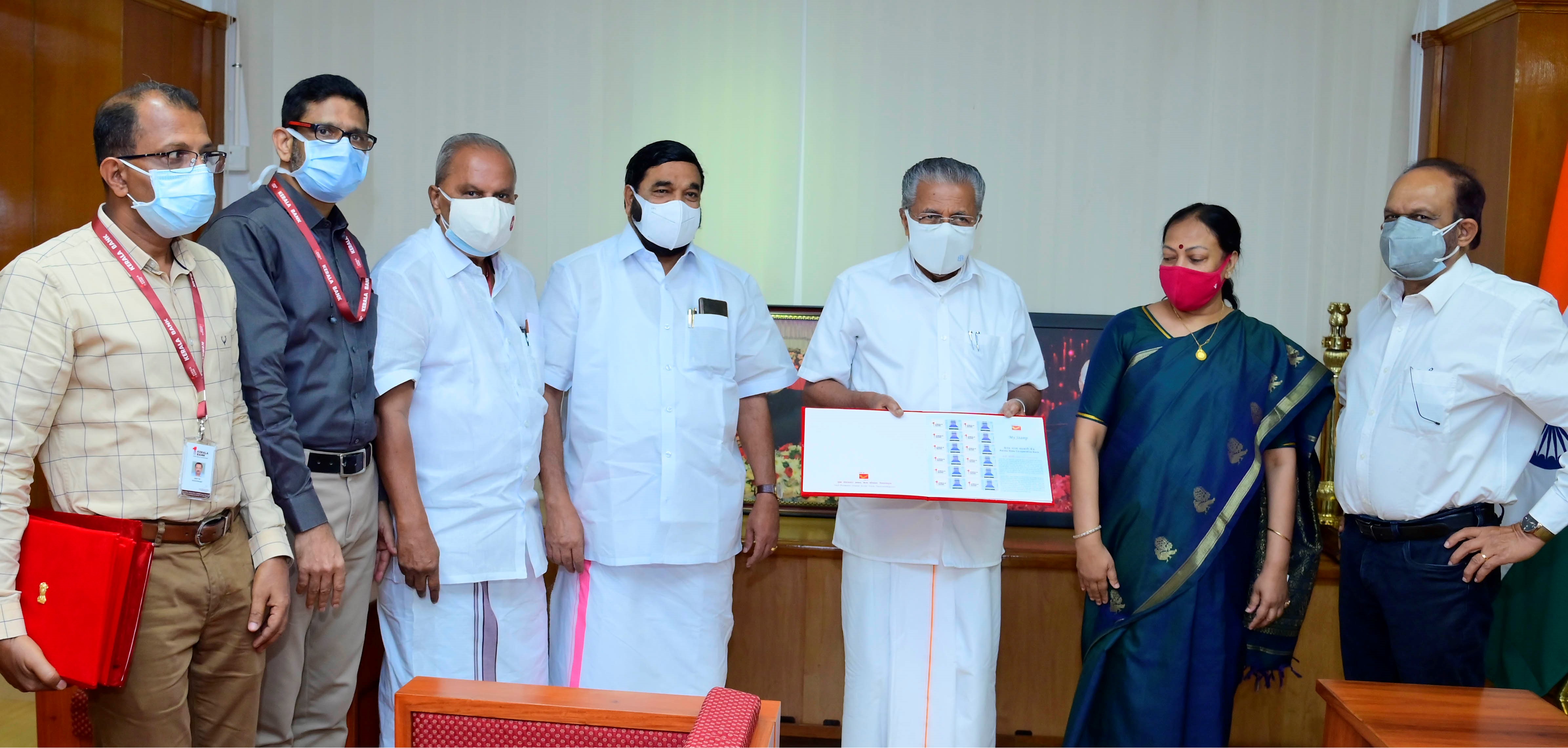 കേരളാ ബാങ്കിനുവേണ്ടി തപാൽ വകുപ്പ് പുറത്തിറക്കിയ തപാൽ സ്റ്റാമ്പ് ബഹു . മുഖ്യമന്ത്രി പ്രകാശനം ചെയ്യുന്നു (29/09/2021)